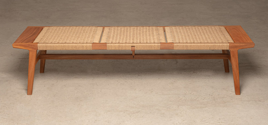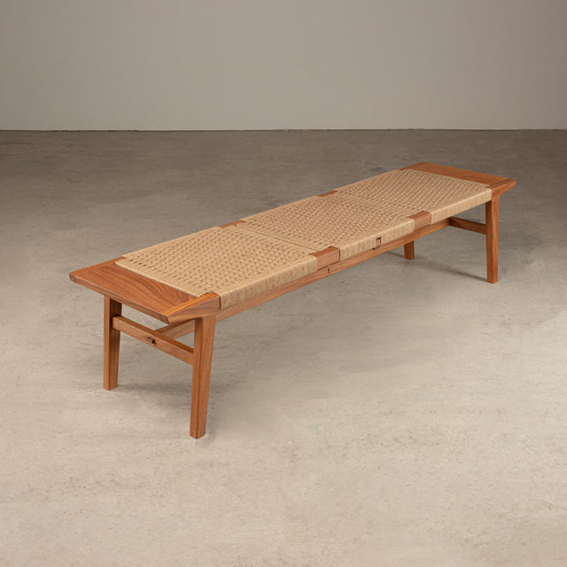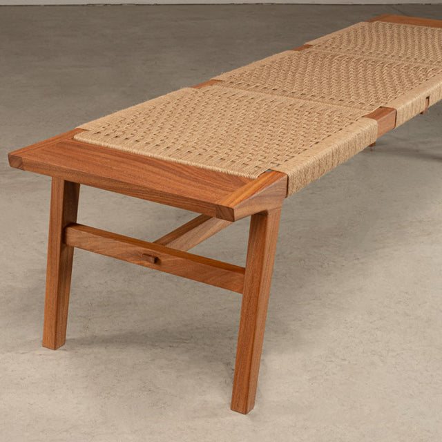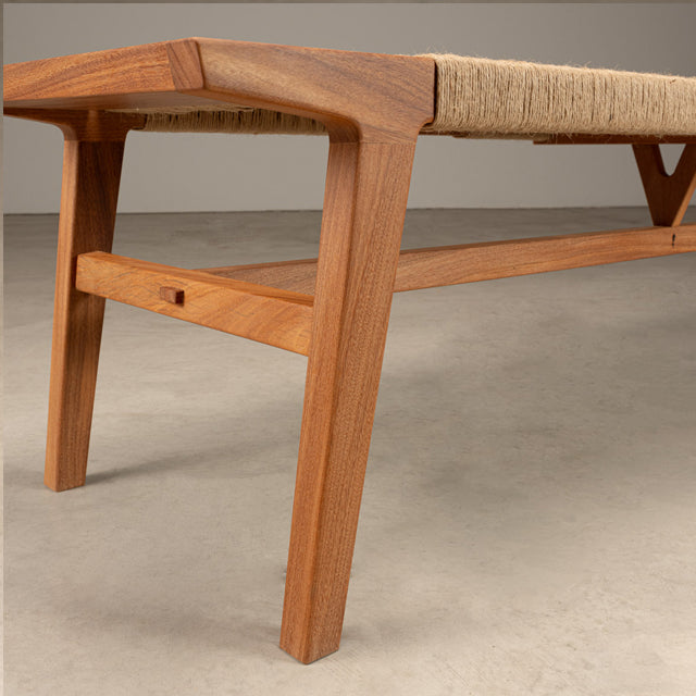 Artesanalmente criado, combina madeira e um assento de tecido. Projetado para ser versátil, ele pode ser usado como uma extremidade da cama ou na sala de estar. É uma peça simples e elegante. Pode ser feito de várias madeiras sólidas e seu assento é criado a partir de corda Ramie.
