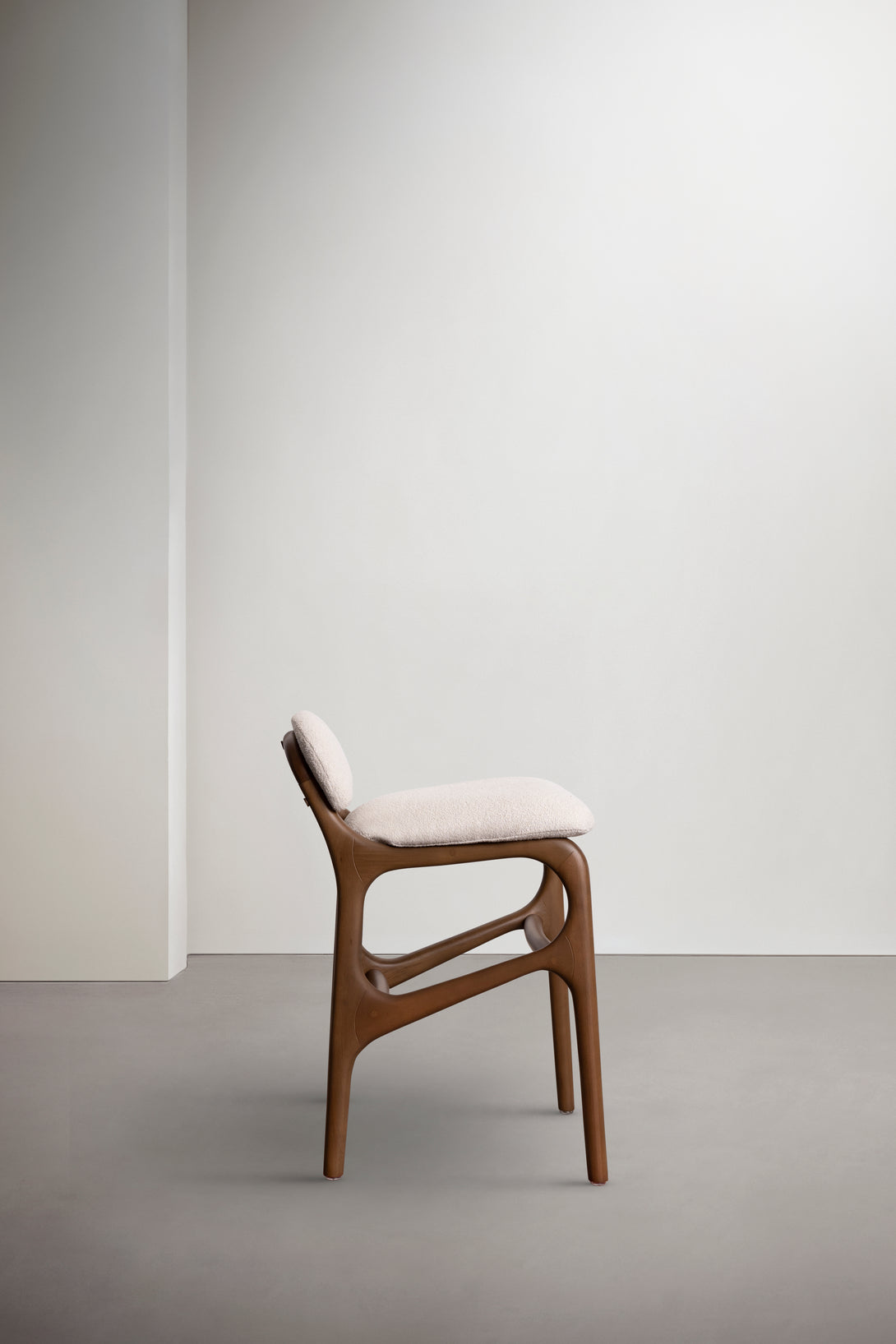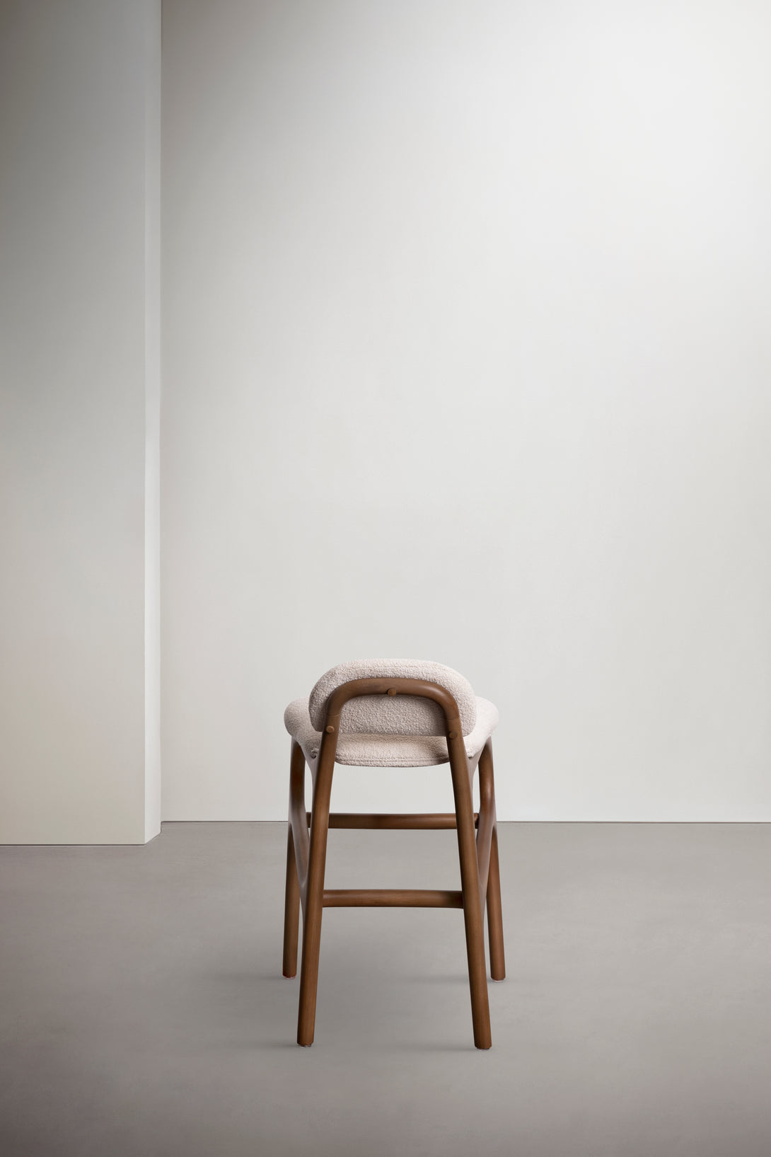 Crafted from reforested wood and upholstered in high-quality fabric, it combines sustainability and durability with a contemporary aesthetic. Its versatile form allows it to adapt easily to different compositions, making it a perfect fit for modern design projects.