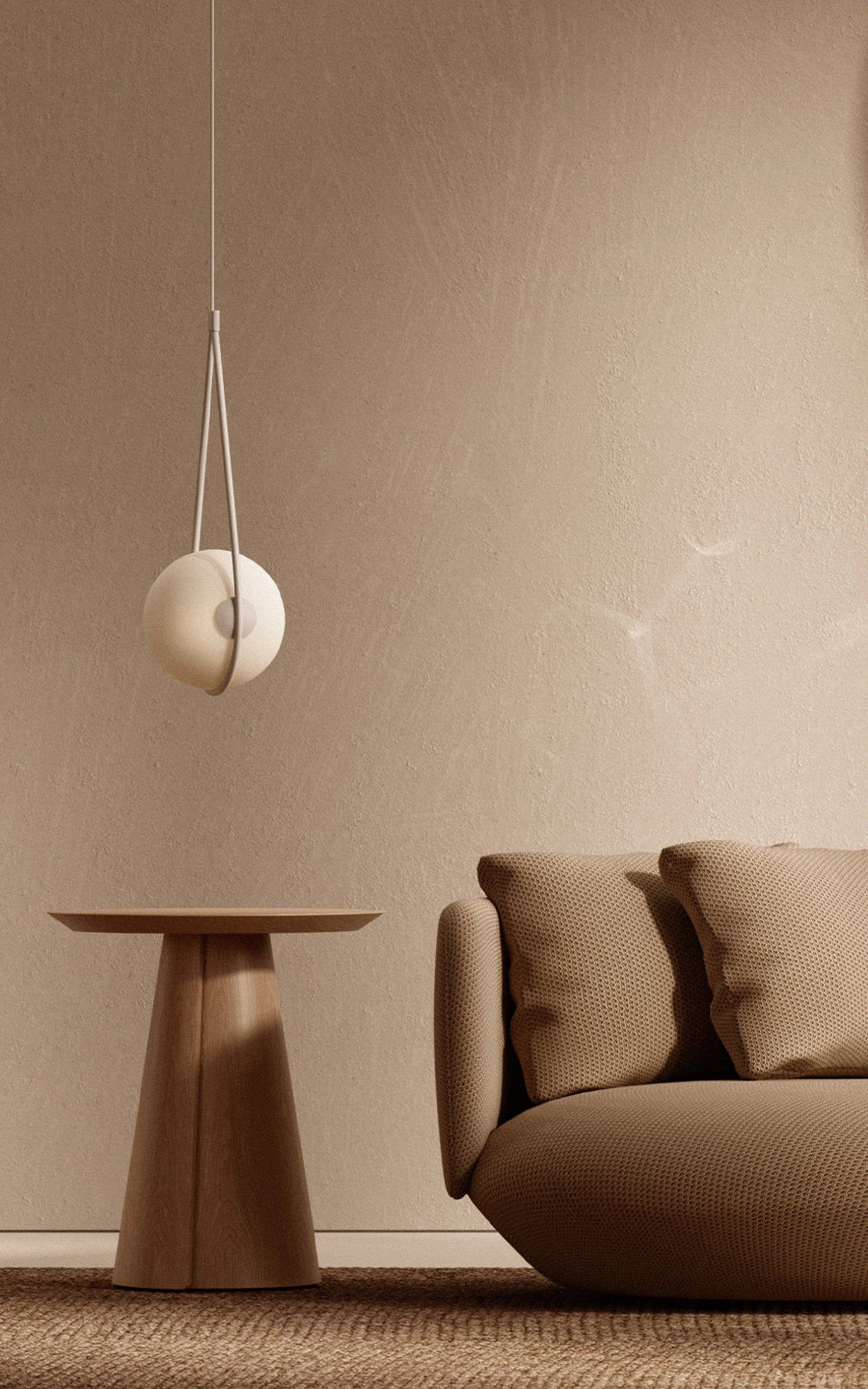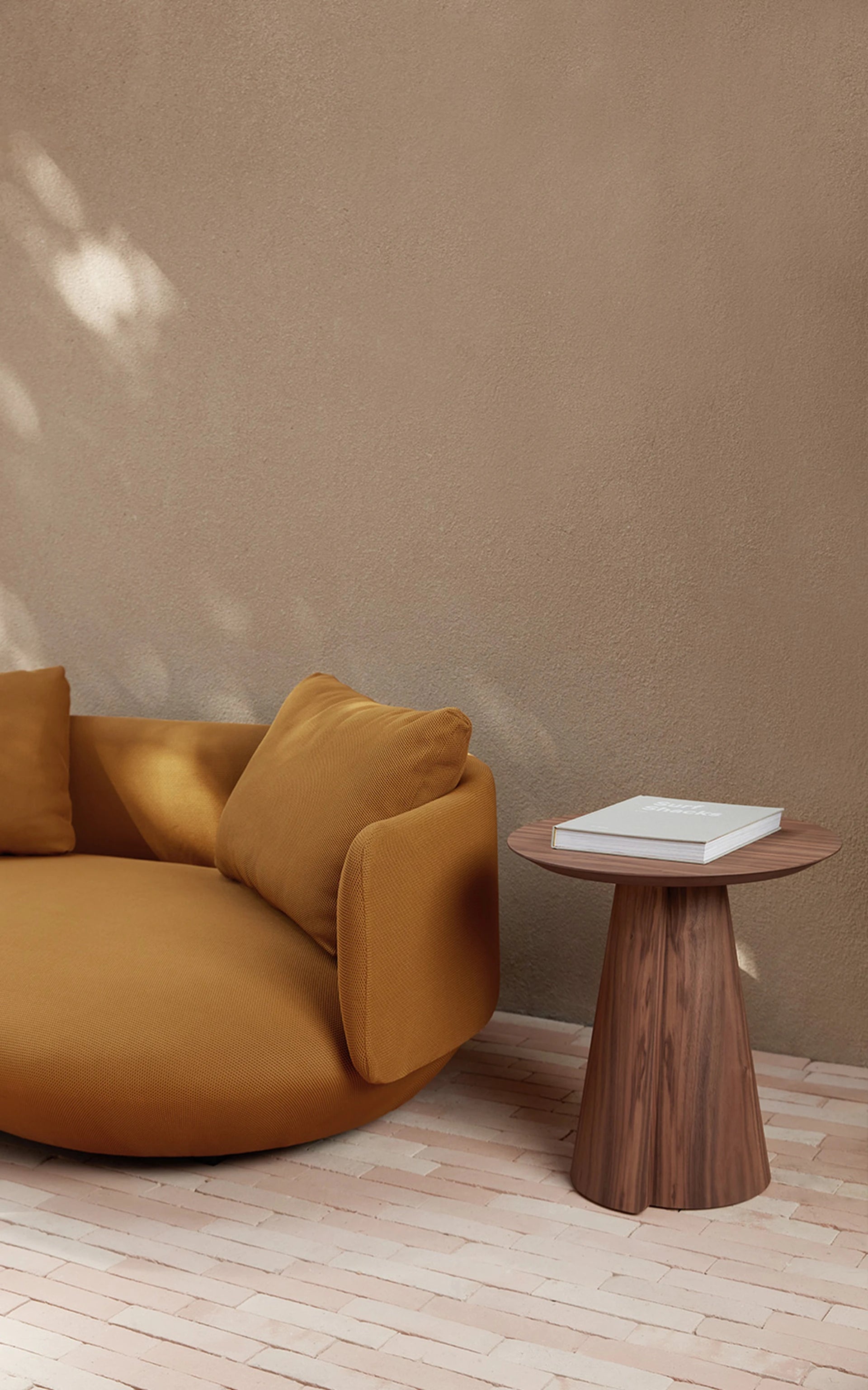 A mesa Volta faz referência à natureza em sua impermanência. O detalhe da base sugere os movimentos naturais e remete às lógicas construtivas da natureza, enquanto a superfície com veios evidentes da lâmina de madeira natural reforça o conceito orgânico da peça.