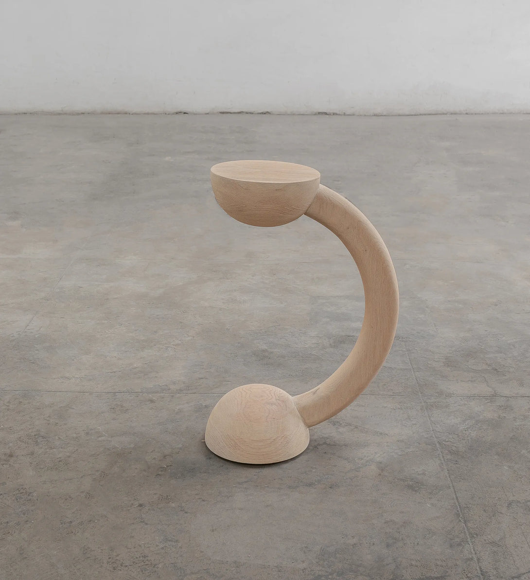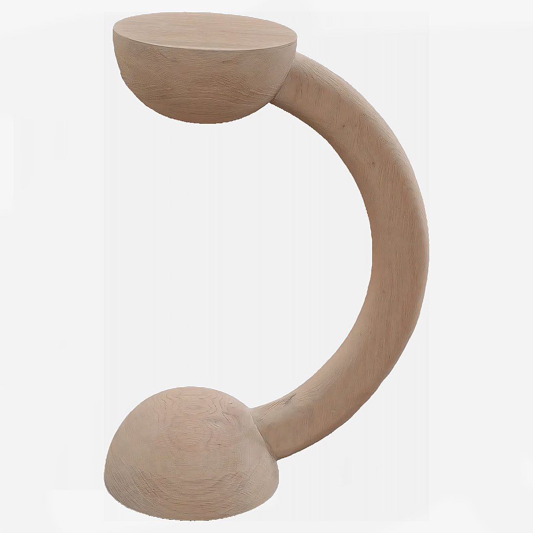 The Bleo Auxiliary Table is a small side table distinguished by its sculptural and organic design, with a shape that resembles a curved desk lamp or a question mark. The piece is crafted from Red Oak Wood with a Cream Wash Finish, giving it a soft and contemporary look. The main structure consists of a hemispherical base that connects to a thick, curved arm, which rises and terminates in a flat, circular resting surface. The combination of gentle curves and the absence of right angles makes this piece not only functional furniture but also a true wooden sculpture.