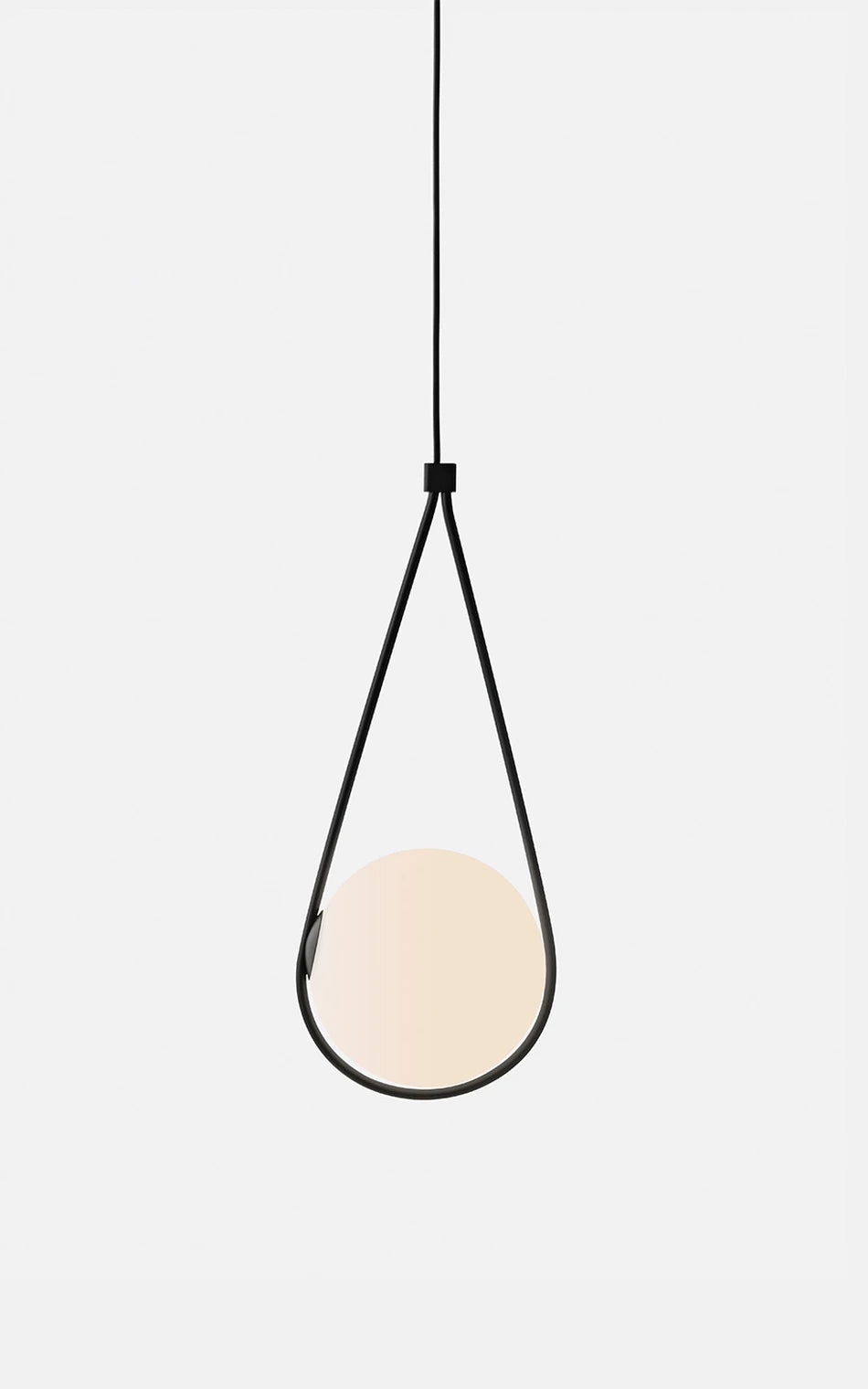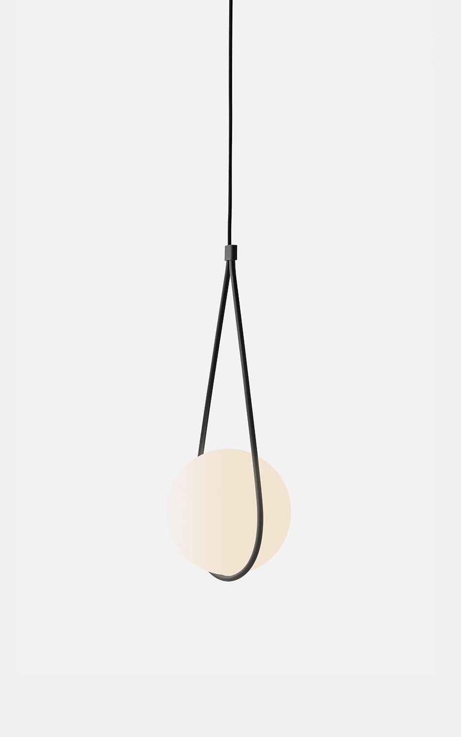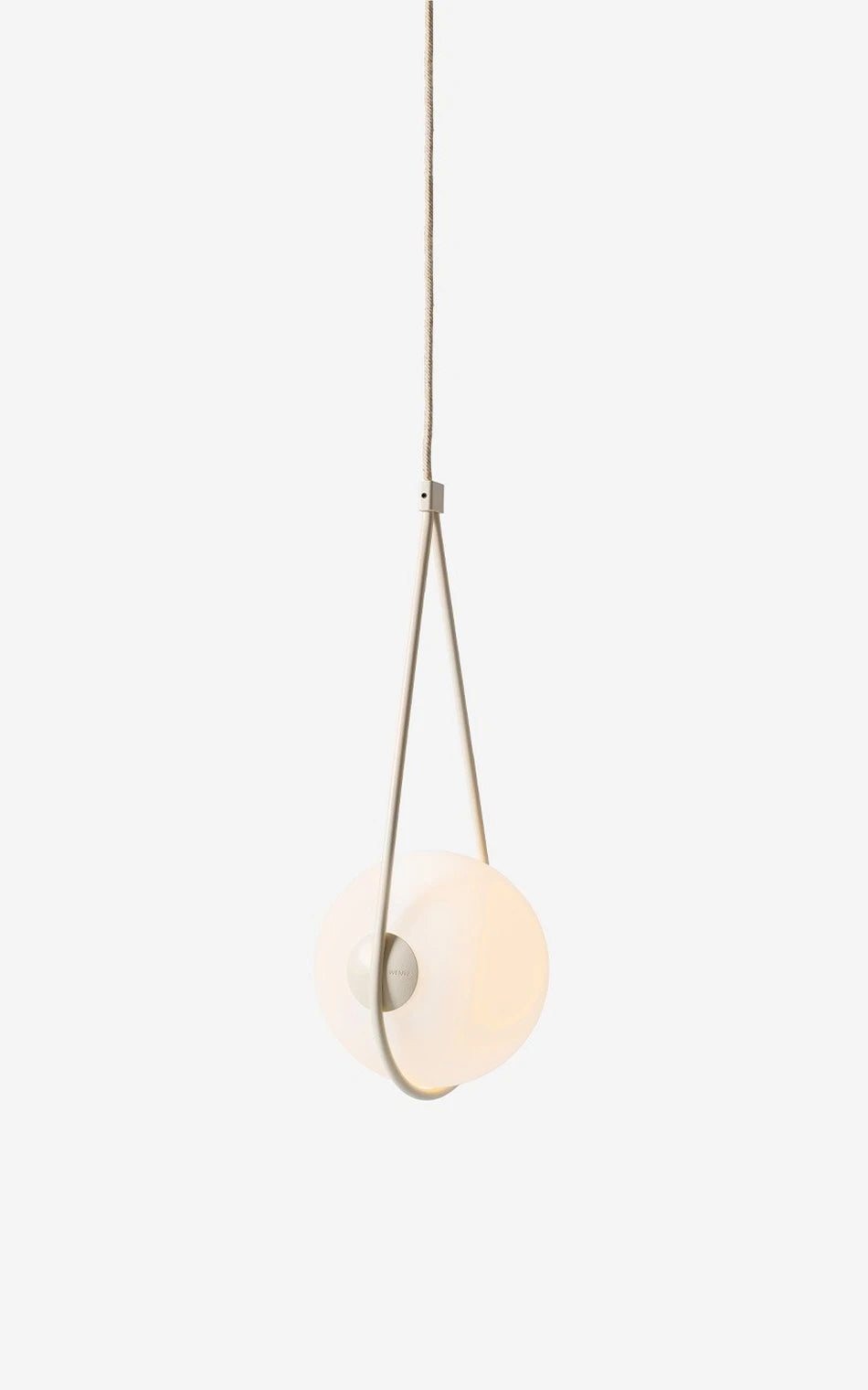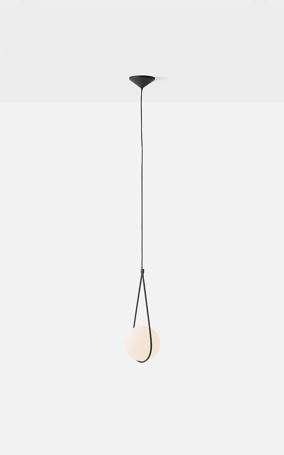 A Luminária Pendente Corda tem o cabo de energia como ponto de partida do projeto. A peça explora a máxima simplicidade das formas e levanta conceitos abstratos como a sensação de gravidade presente na composição do objeto. Sua fina estrutura metálica, que envolve a esfera de vidro soprado, sugere uma continuação do cabo e foi pensada para parecer que a esfera está atuando sobre a estrutura.