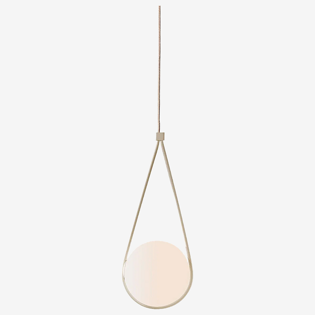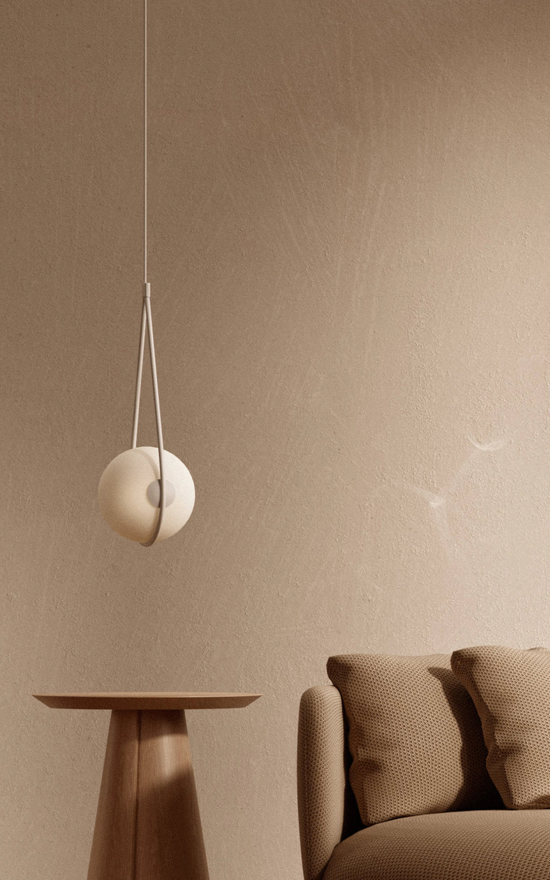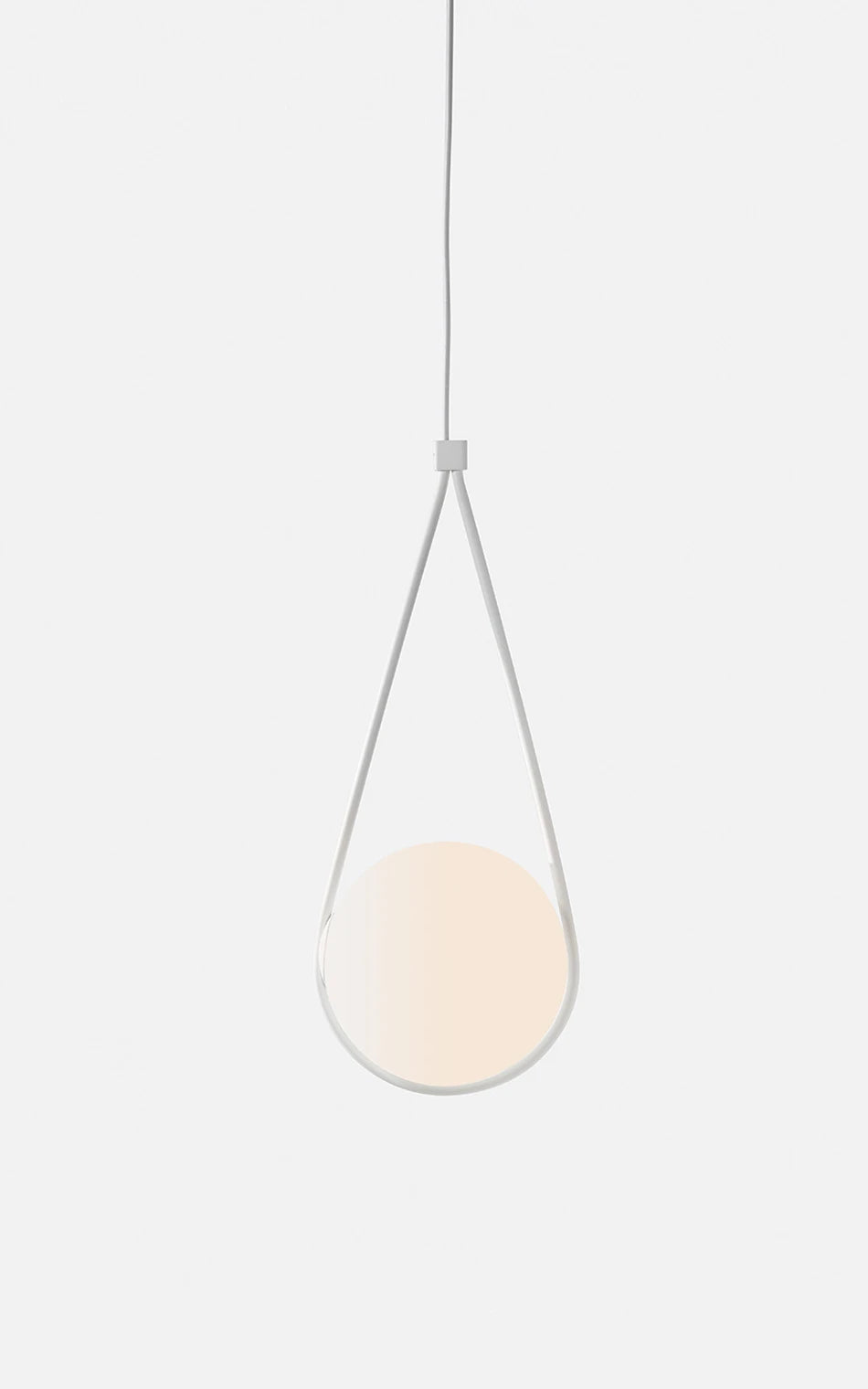A Luminária Pendente Corda tem o cabo de energia como ponto de partida do projeto. A peça explora a máxima simplicidade das formas e levanta conceitos abstratos como a sensação de gravidade presente na composição do objeto. Sua fina estrutura metálica, que envolve a esfera de vidro soprado, sugere uma continuação do cabo e foi pensada para parecer que a esfera está atuando sobre a estrutura.