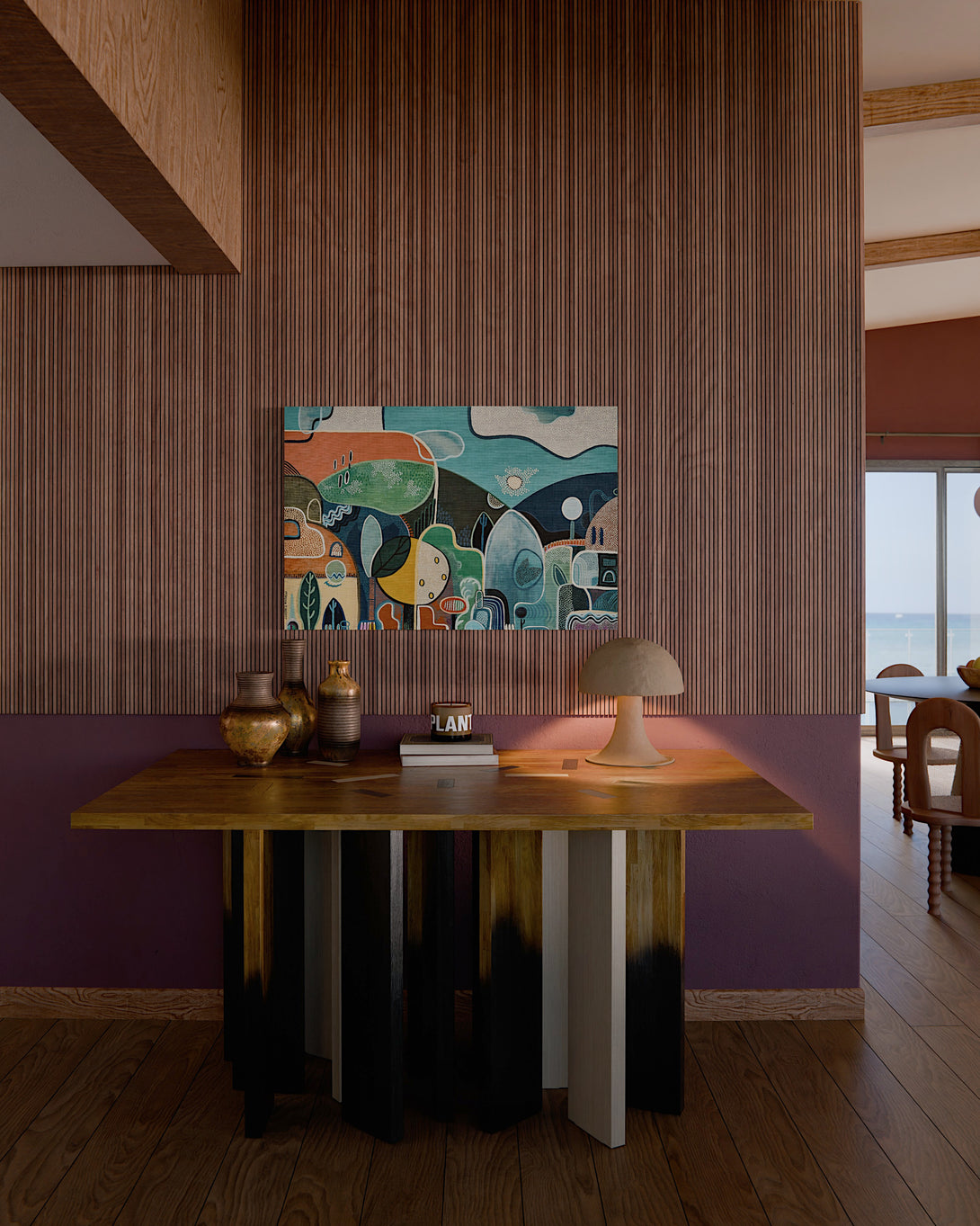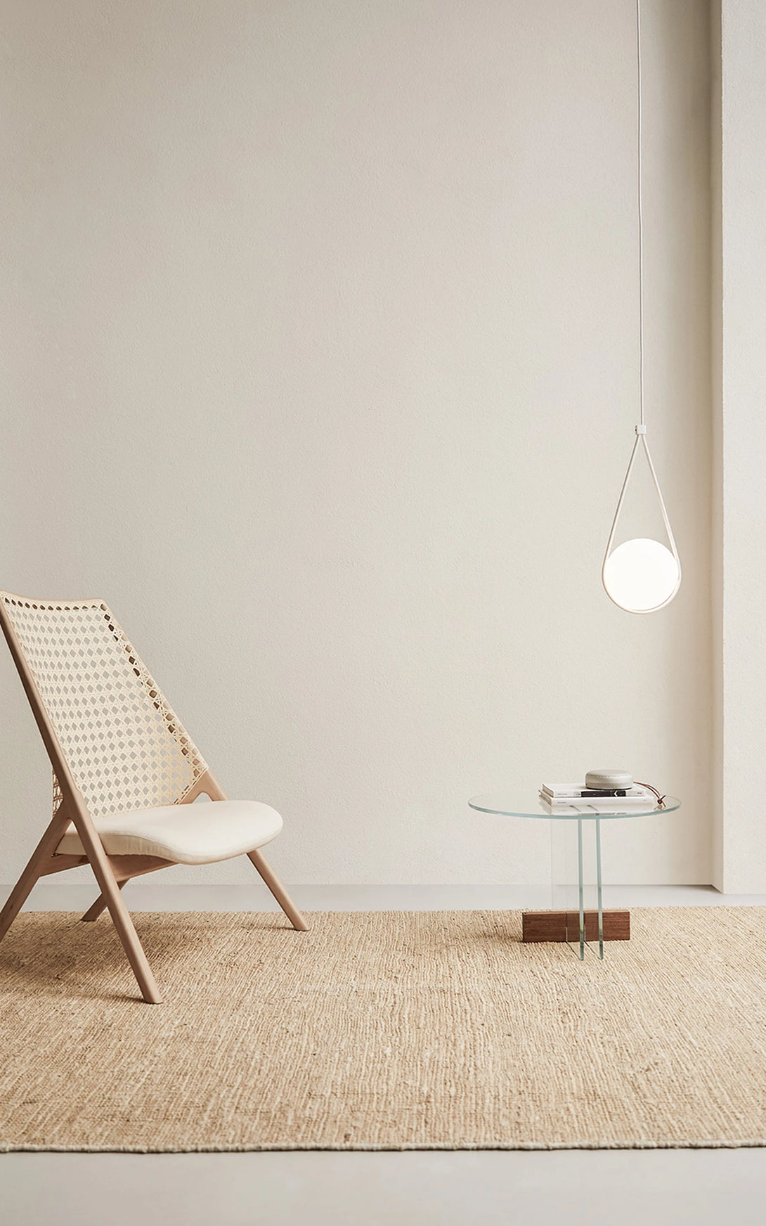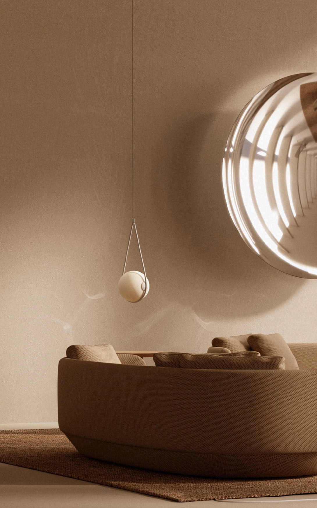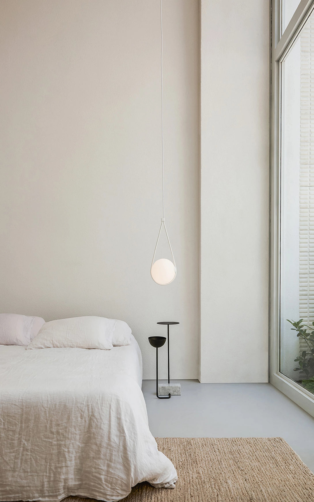 A Luminária Pendente Corda tem o cabo de energia como ponto de partida do projeto. A peça explora a máxima simplicidade das formas e levanta conceitos abstratos como a sensação de gravidade presente na composição do objeto. Sua fina estrutura metálica, que envolve a esfera de vidro soprado, sugere uma continuação do cabo e foi pensada para parecer que a esfera está atuando sobre a estrutura.