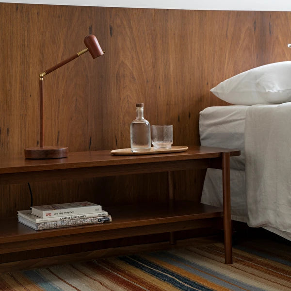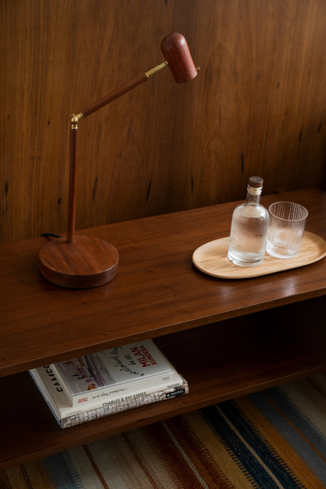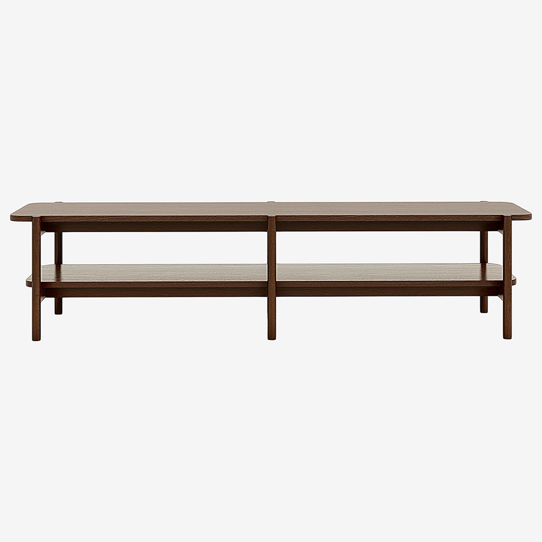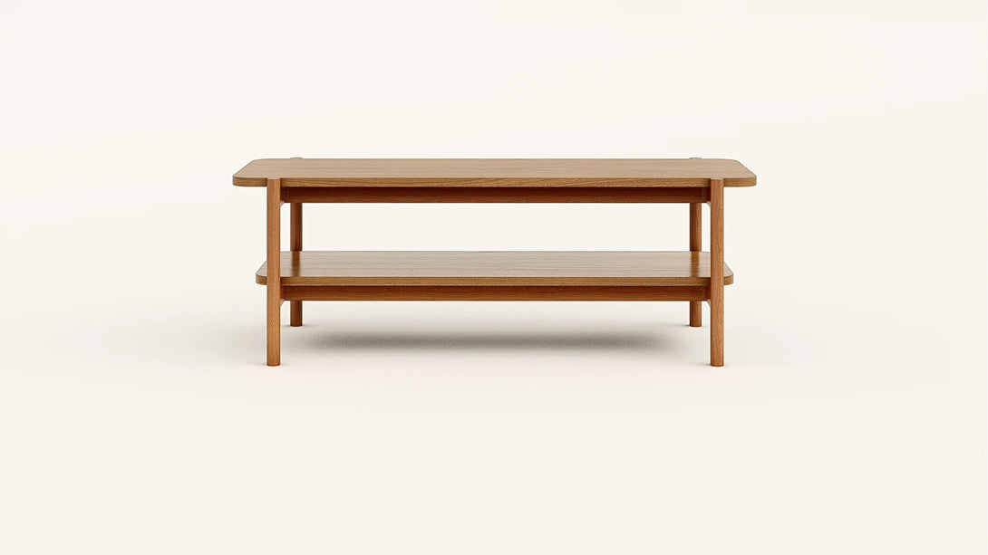 O assento e a prateleira, com suas bordas suavemente arredondadas, repousam de forma sutil sobre a estrutura exposta, feita de madeira maciça torneada.