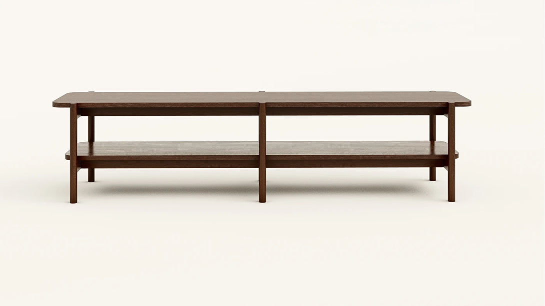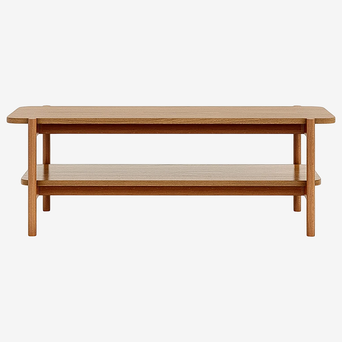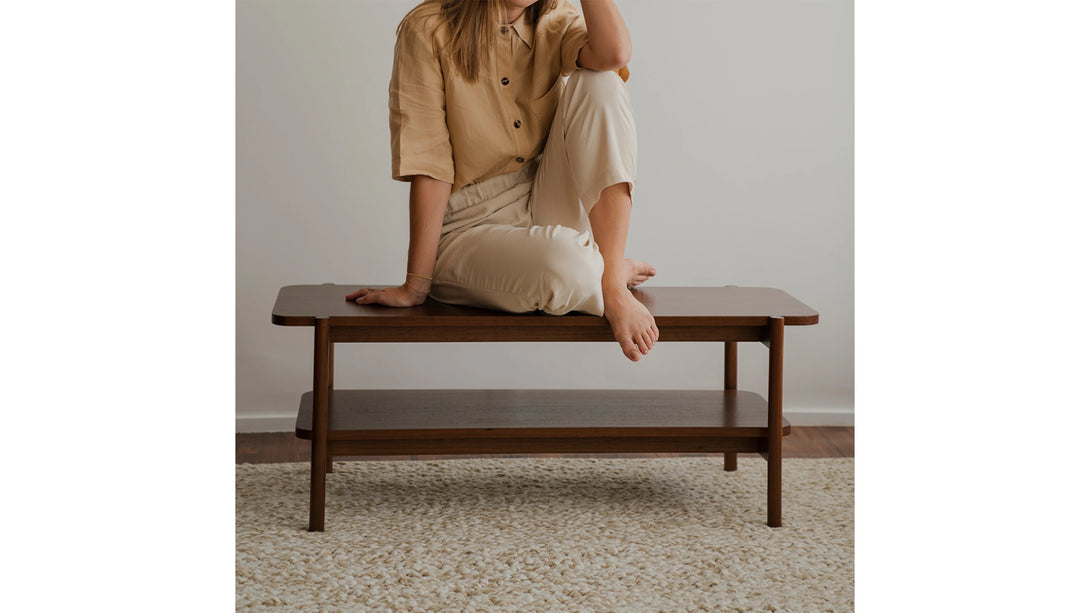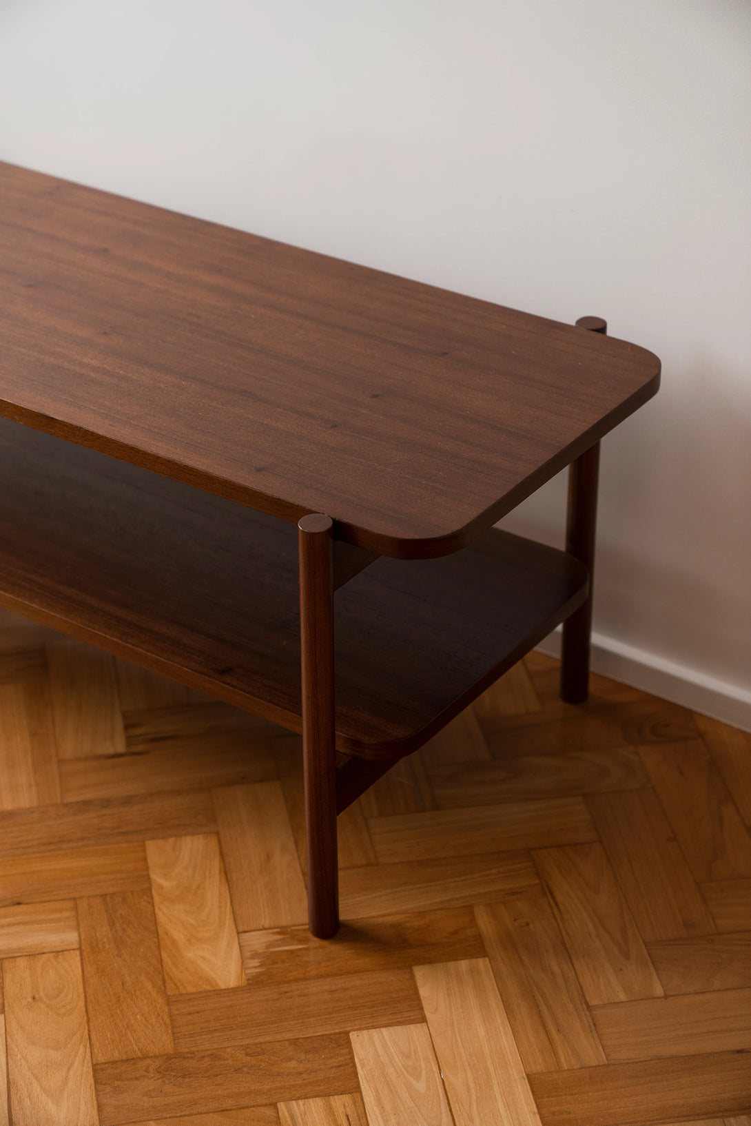 Banco com estrutura em madeira maciça + assento e prateleira em MDF revestidos com lâmina de madeira.