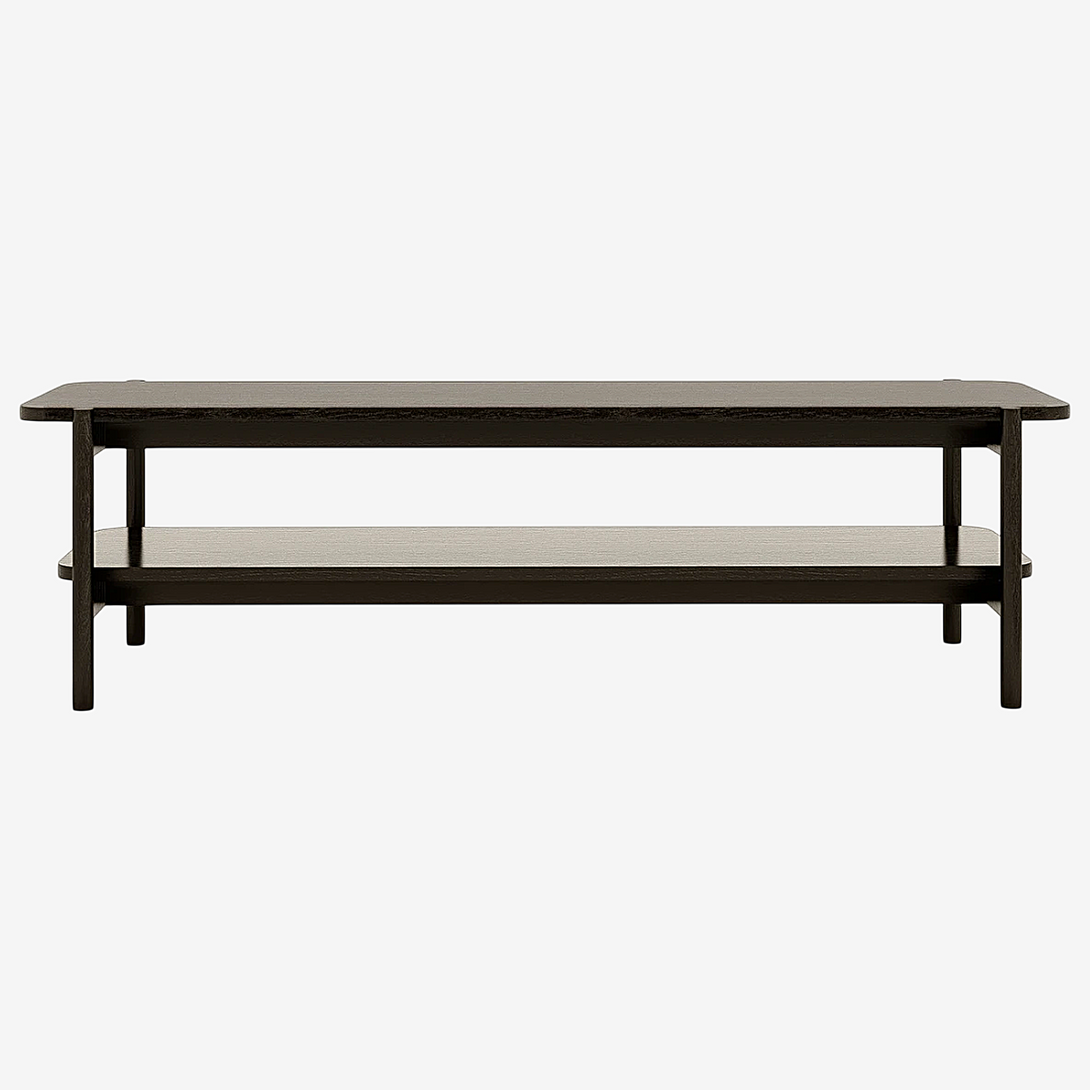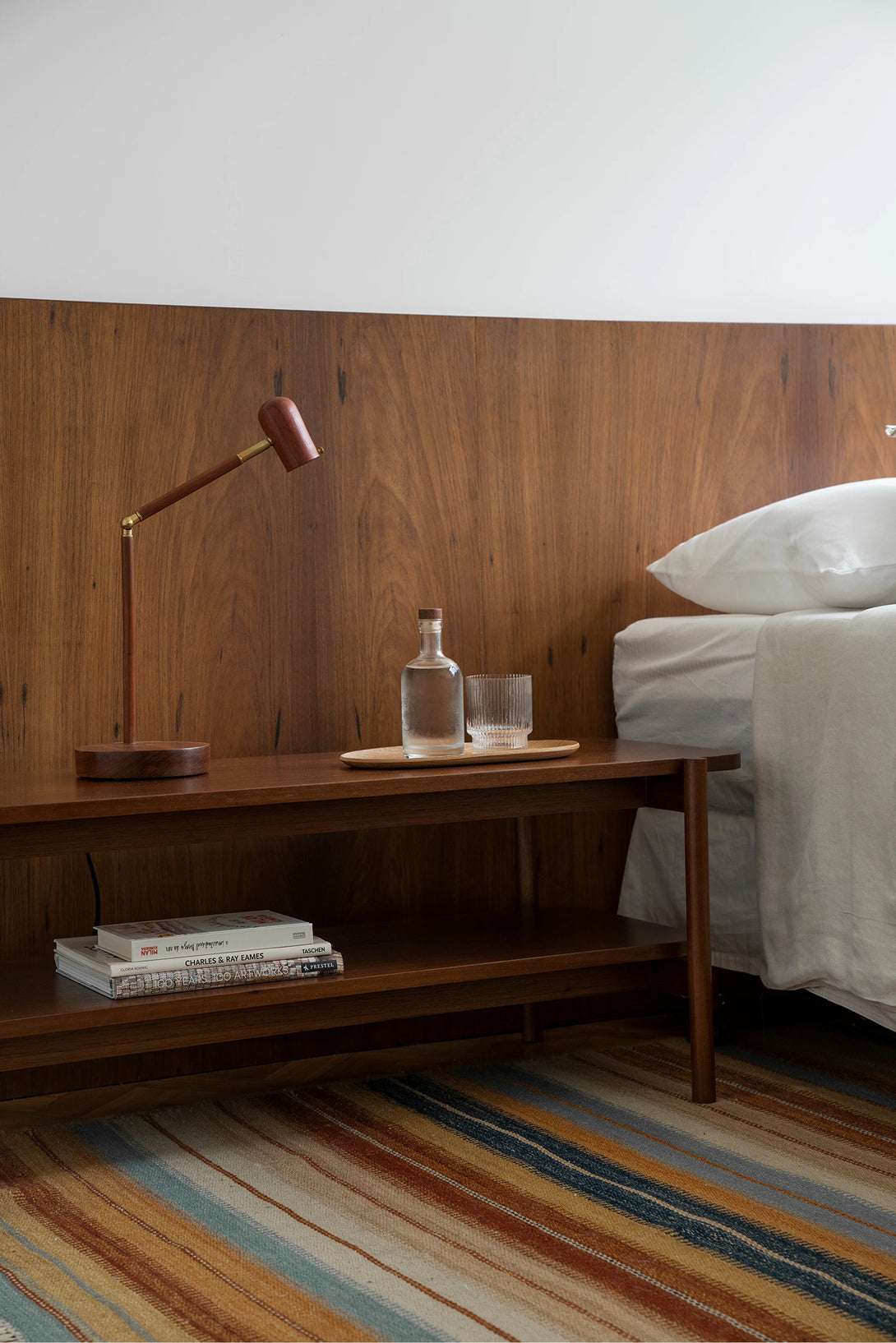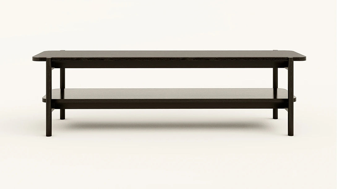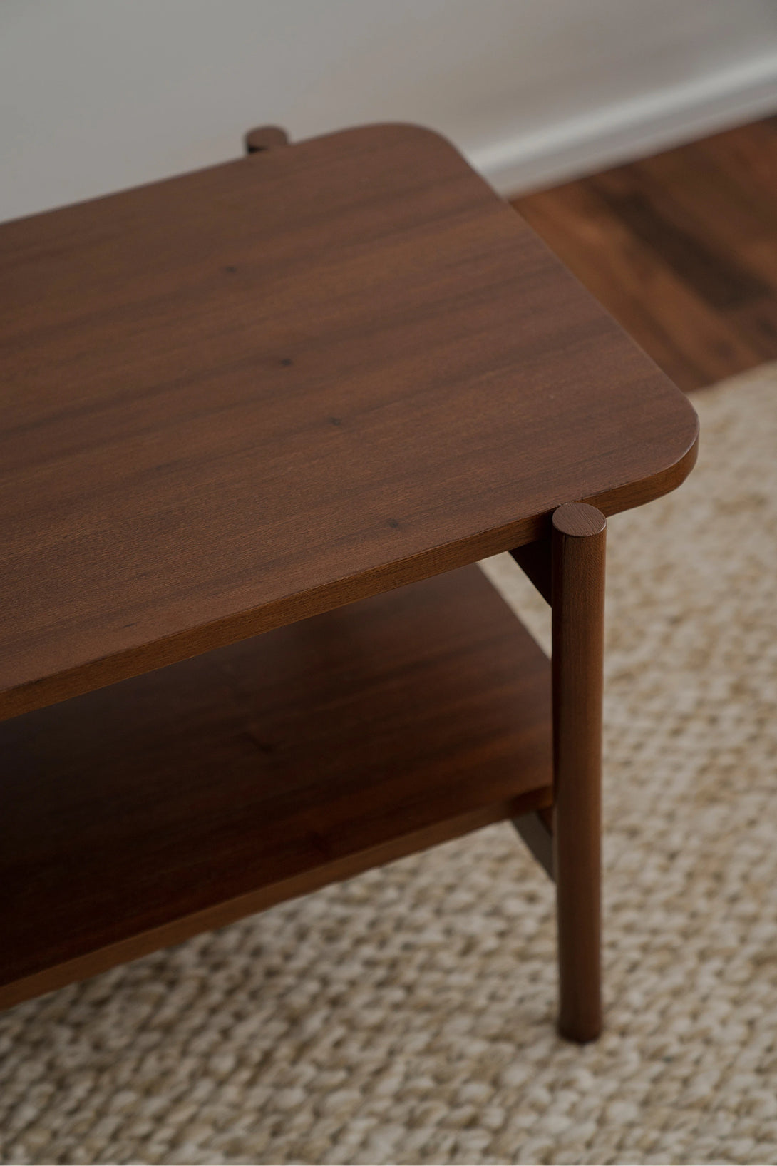 Banco com estrutura em madeira maciça + assento e prateleira em MDF revestidos com lâmina de madeira.