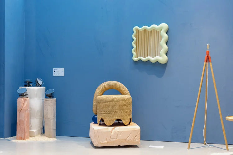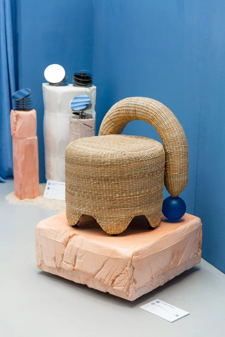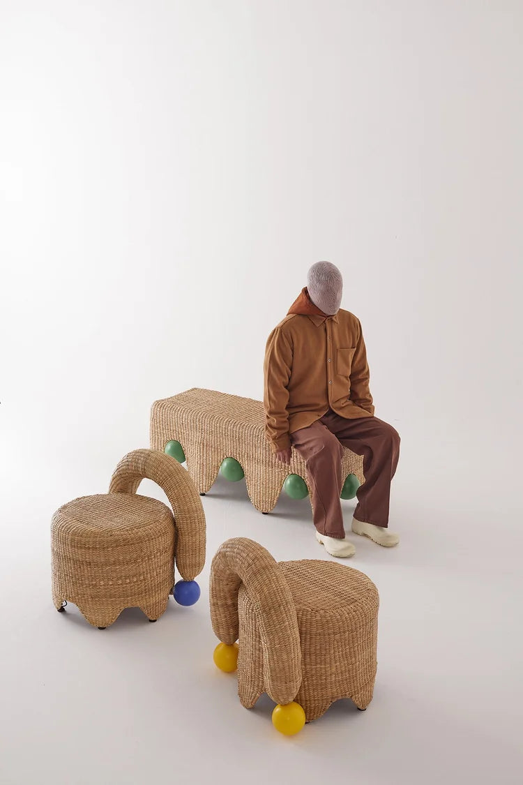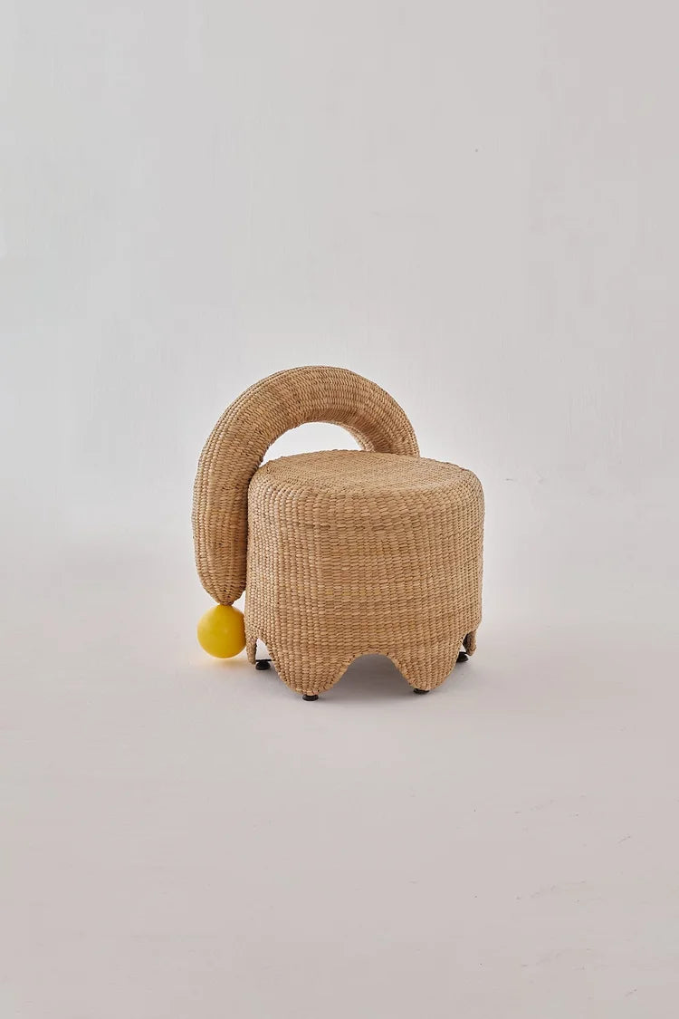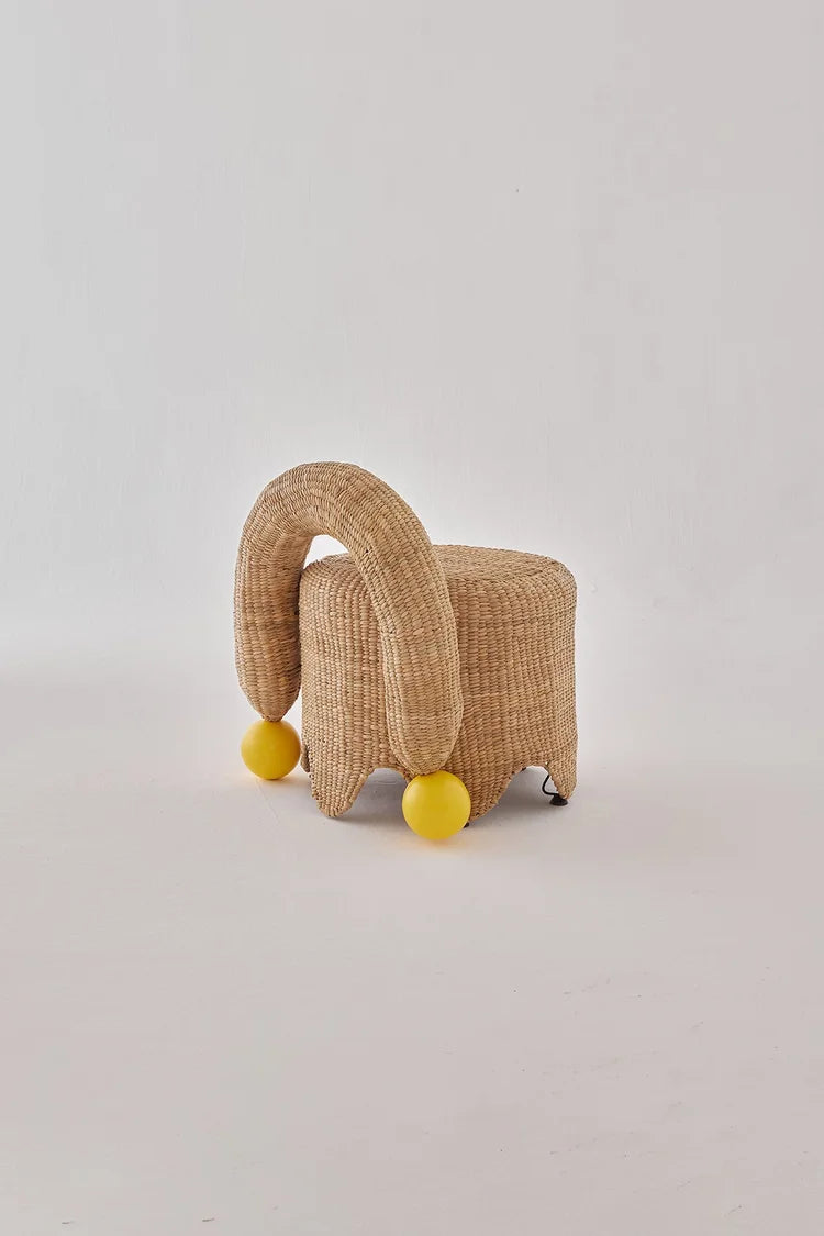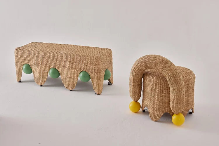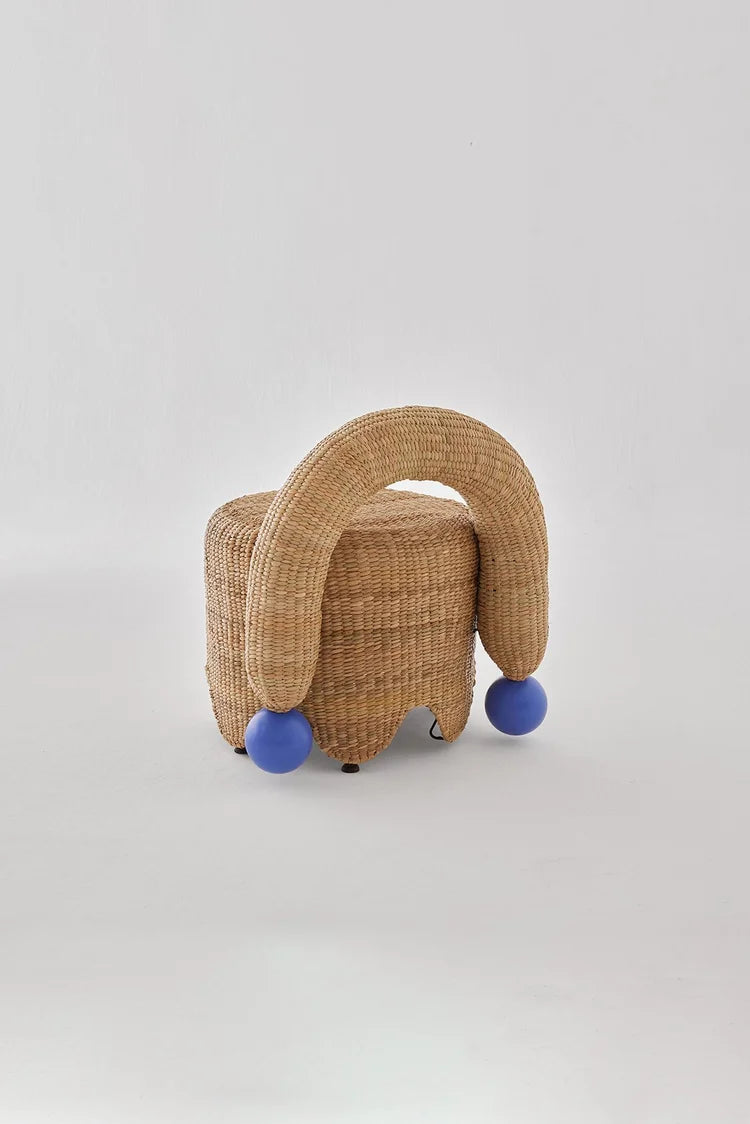 The Jolgorio Stool combines diverse materials with contemporary, sophisticated design. Its metal structure provides strength, while the chuspata fiber details and lacquered oak wood spheres add texture, color, and a handcrafted touch, making the stool a standout piece.