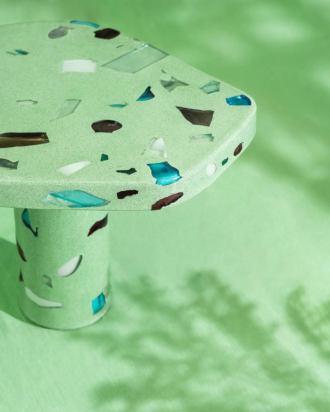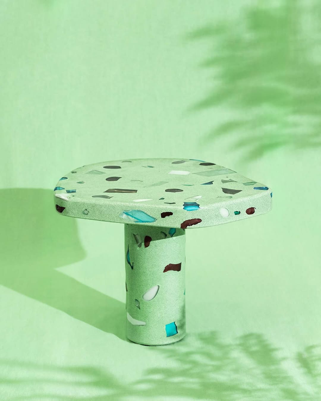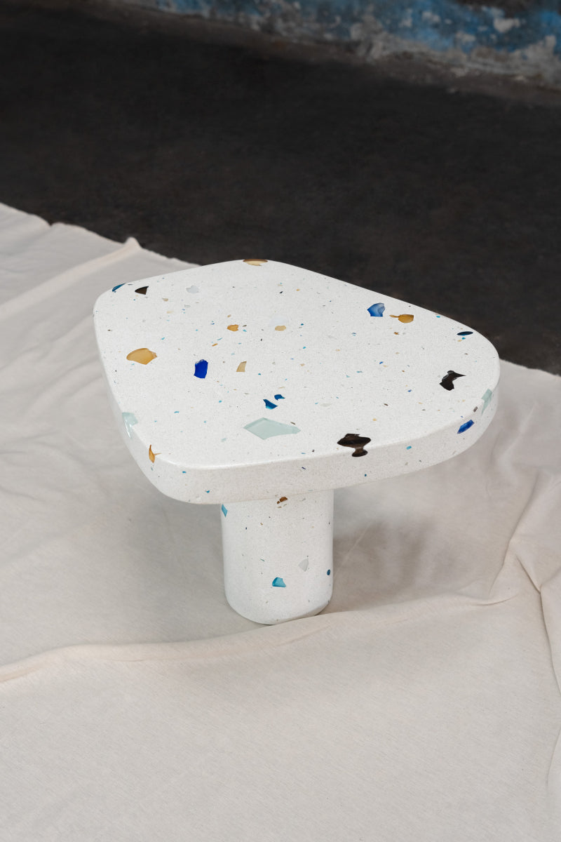 A Mesa Lateral Mono possui tampo amorfo com 4 variações possíveis e é composta por cristais de vidro provenientes de resíduos de uma fábrica em Minas Gerais. Esse desperdício contribui para a criação de padrões únicos e coloridos para cada mesa produzida. O tampo é apoiado sobre um único pé cilíndrico maciço, que, devido ao seu peso, garante estabilidade e leveza visual à mesa.