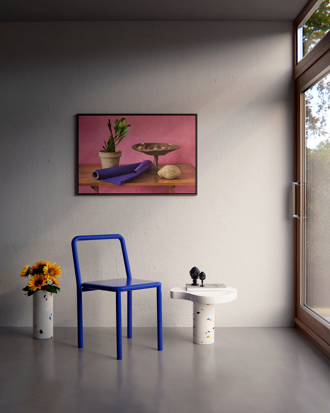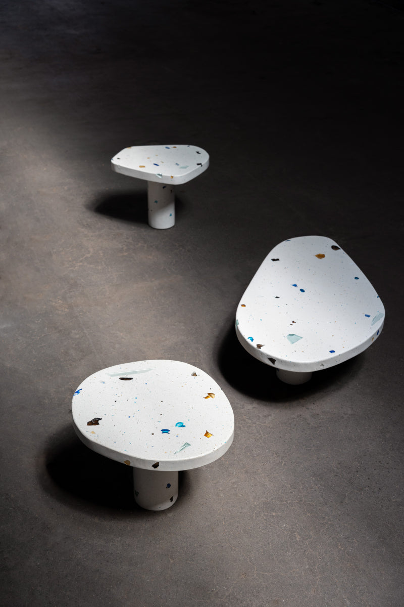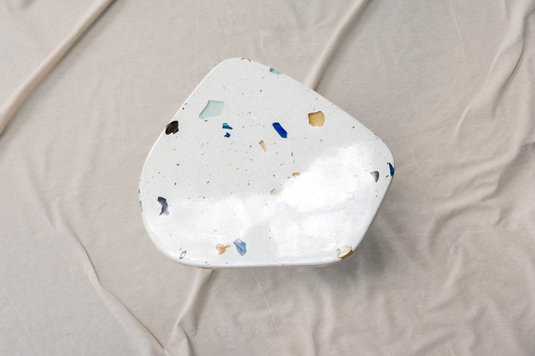 A Mesa Lateral Mono possui tampo amorfo com 4 variações possíveis e é composta por cristais de vidro provenientes de resíduos de uma fábrica em Minas Gerais. Esse desperdício contribui para a criação de padrões únicos e coloridos para cada mesa produzida. O tampo é apoiado sobre um único pé cilíndrico maciço, que, devido ao seu peso, garante estabilidade e leveza visual à mesa.