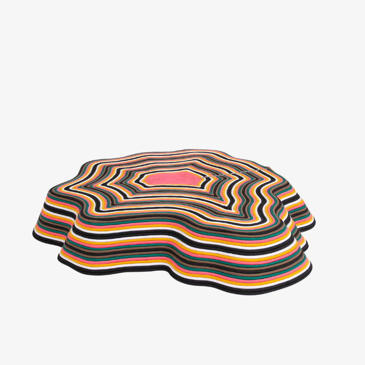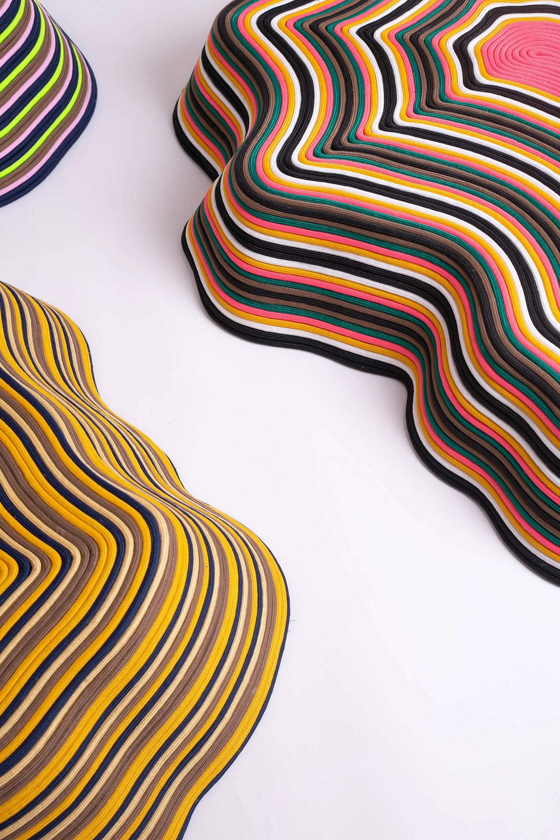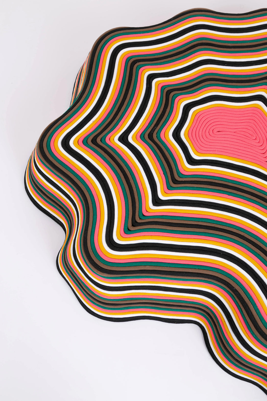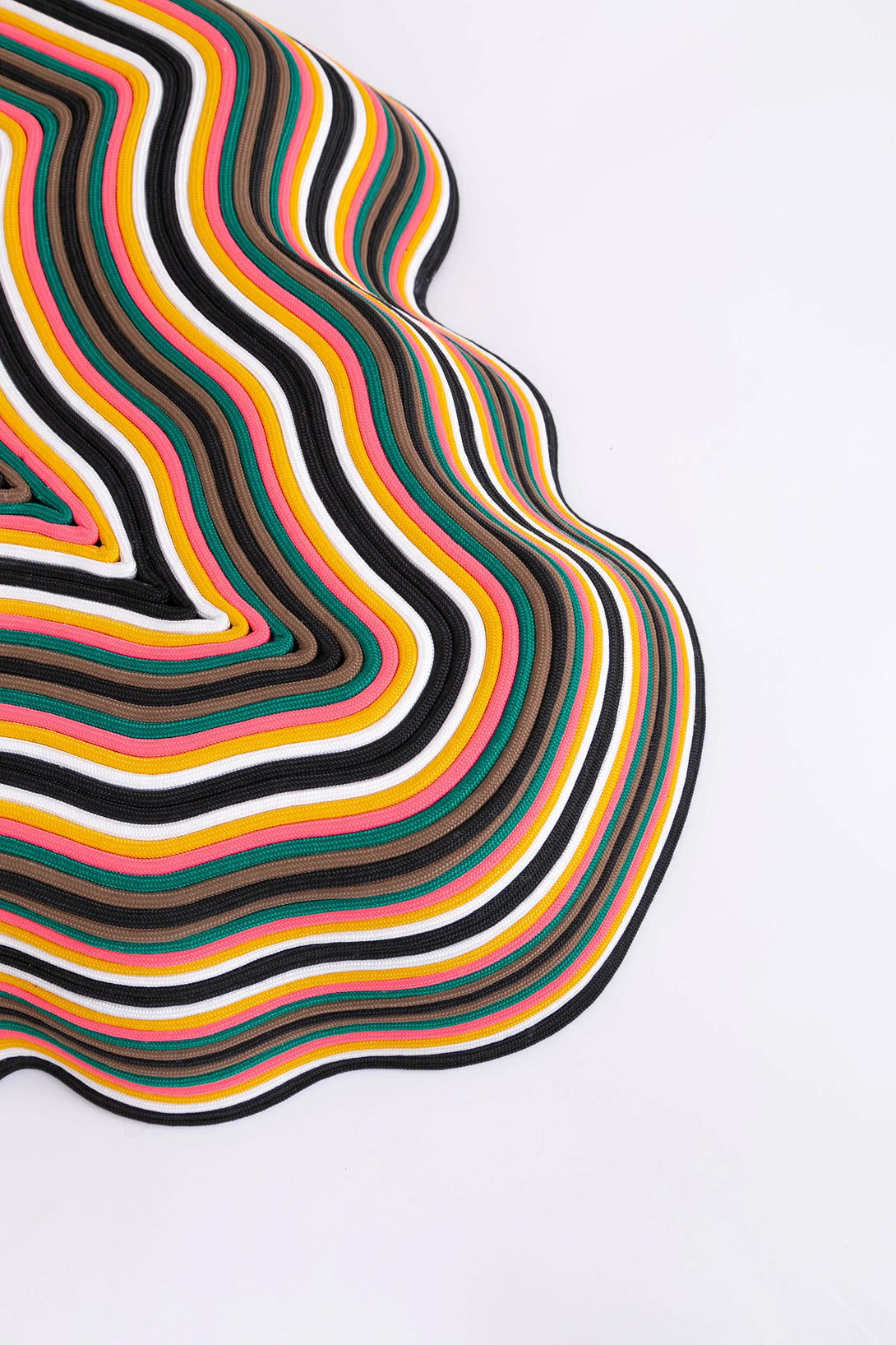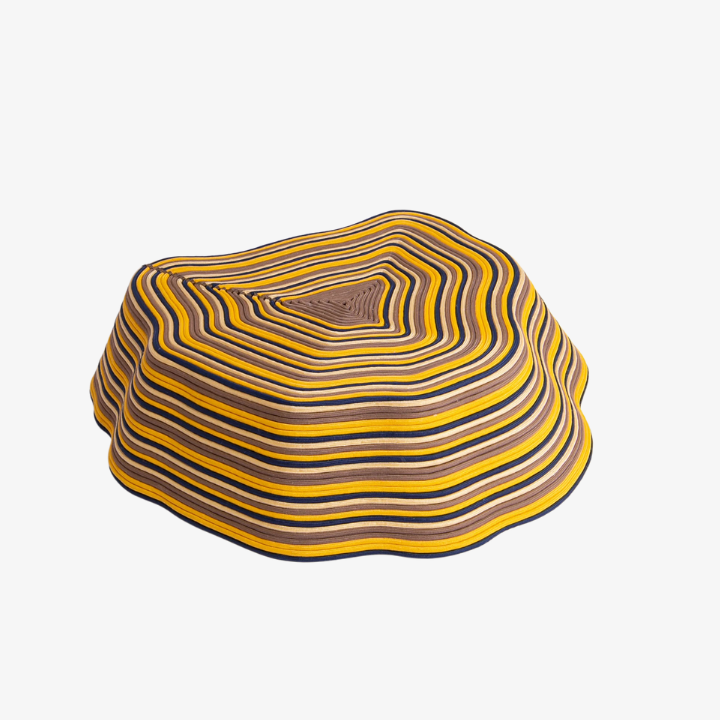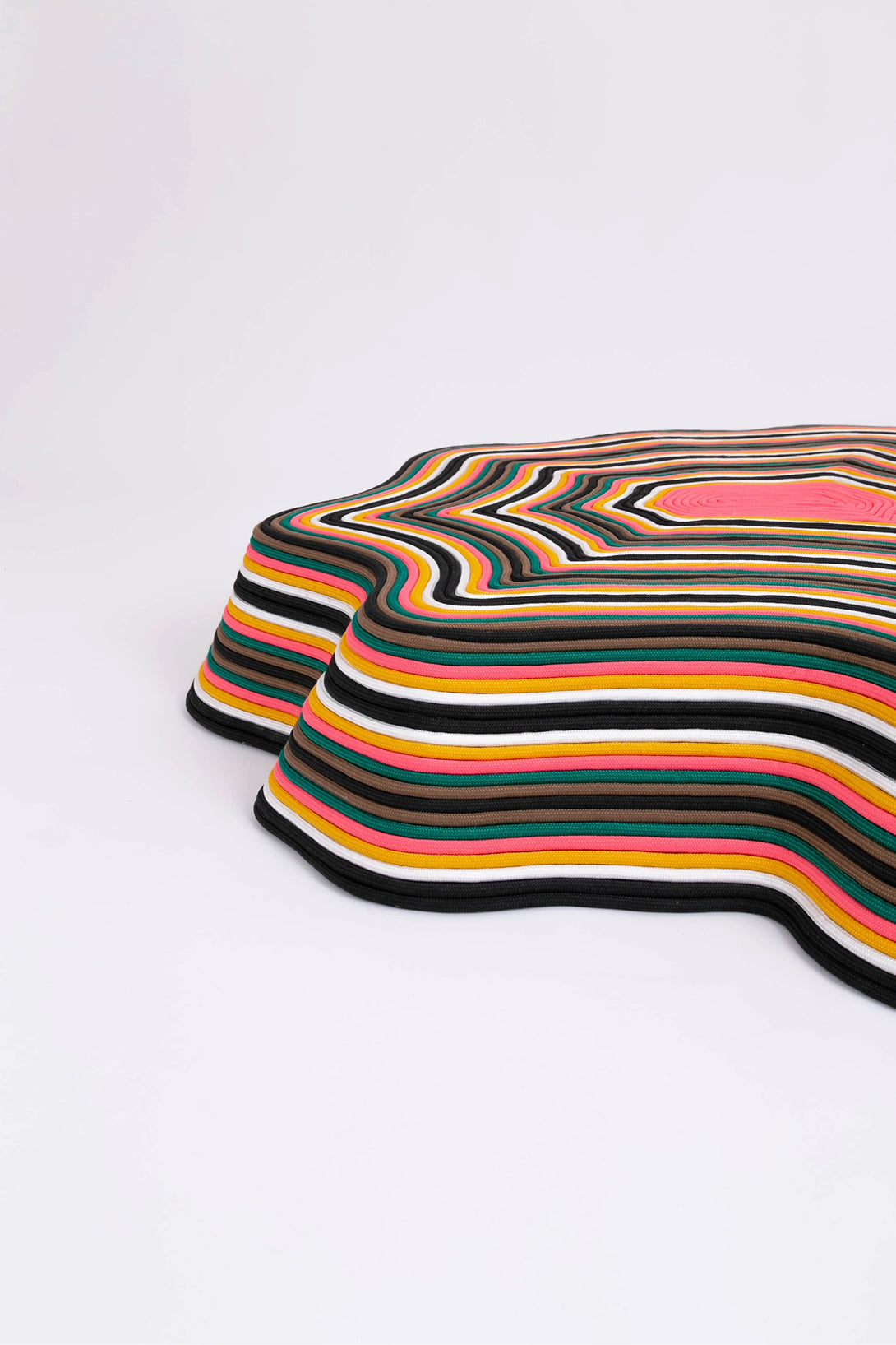 The TRONCO tables arise from the concept of a tree trunk cut transversely, revealing its rings. The ropes are skillfully inserted into the piece, forming a harmonious composition, following the sinuosity of the trunk and its rings, which, in turn, captivate the observer's gaze with vibrant colors. Inspired by conventional coffee tables, the TRONCO tables dispense with the direct use of wood and incorporate eccentric colors and shapes that evoke the appearance of a tree trunk. The ropes, made from recycled PET filaments, are the protagonists of this free interpretation by the designer.